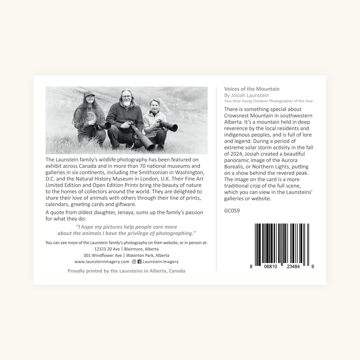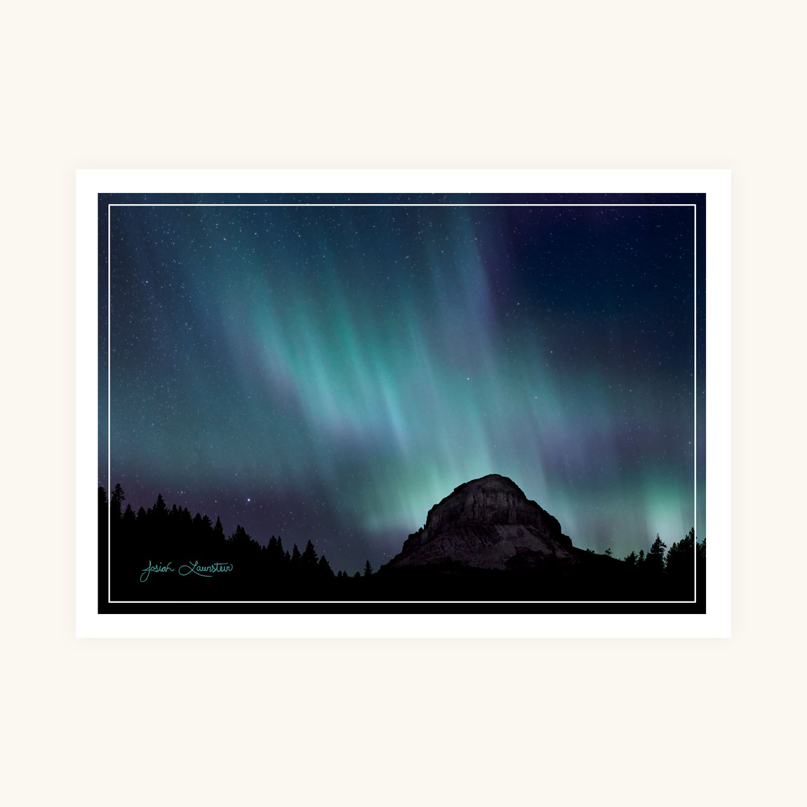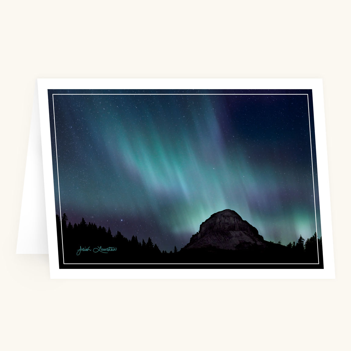 There is something special about Crowsnest Mountain in southwestern Alberta. It’s a mountain held in deep reverence by the local residents and indigenous peoples, and is full of lore and legend. During a period of extreme solar storm activity in the fall of 2024, Josiah created a beautiful panoramic image of the Aurora Borealis, or Northern Lights, putting on a show behind the revered peak. The image on the card is a more traditional crop of the full scene, which you can view in the Launsteins’ galleries or website.