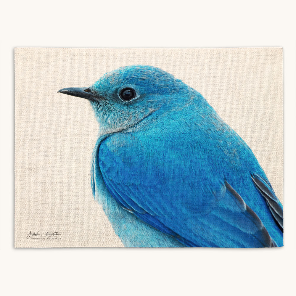 Every spring the Launsteins start watching for the first Mountain Bluebirds to arrive in southwest Alberta, Canada. Josiah was out photographing a male bluebird as it gathered nesting material with its mate one April day when it surprised him and perched almost beside him! Josiah quietly shifted his lens around and framed up an extreme close-up to show the incredible feather detail and beautiful tones and subtle shading these special birds have.